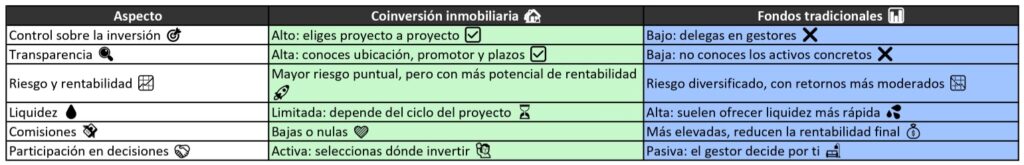 En definitiva, si quieres participar activamente en el mercado inmobiliario y maximizar la rentabilidad de tu inversión, la coinversión es una opción que destaca frente a los fondos. Si, por el contrario, prefieres delegar y olvidarte del día a día, los fondos te aportan tranquilidad y liquidez 📊.