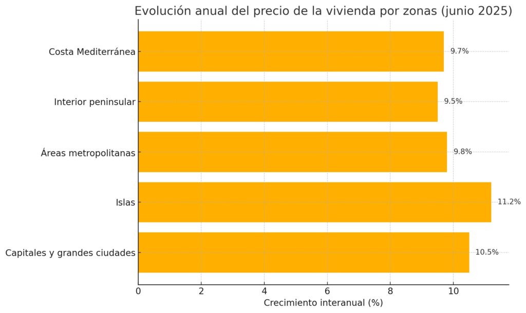 El mercado inmobiliario español continúa en plena ebullición. Según el último informe del Índice General Tinsa IMIE correspondiente al mes de junio, el precio de la vivienda nueva y usada creció un 1,1 % en tasa mensual, frente al 0,9 % registrado en mayo. Este ritmo de crecimiento deja una variación interanual del 10,6 %, consolidando la tendencia alcista que se ha intensificado desde 2021.