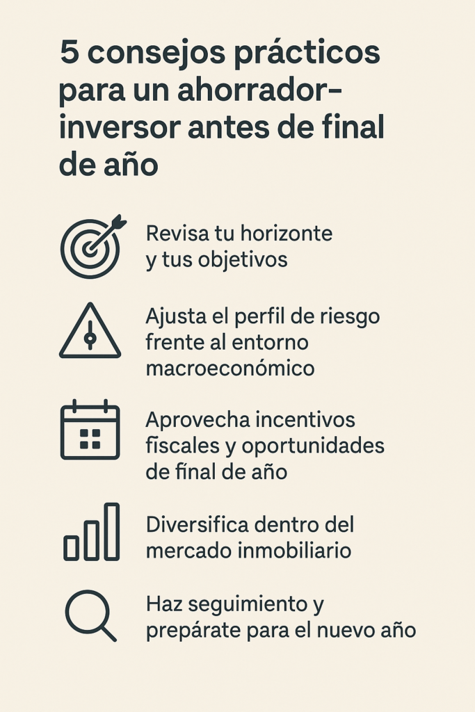 Con el cierre del año a la vista, ya es momento de que el ahorrador-inversor dé un último repaso a su estrategia para maximizar la rentabilidad, en especial si estás mirando hacia el mercado inmobiliario o la inversión inmobiliaria. Desde Equalice te proponemos cinco consejos ágiles, cercanos y efectivos para que tu dinero trabaje mejor en lo que queda del ejercicio.