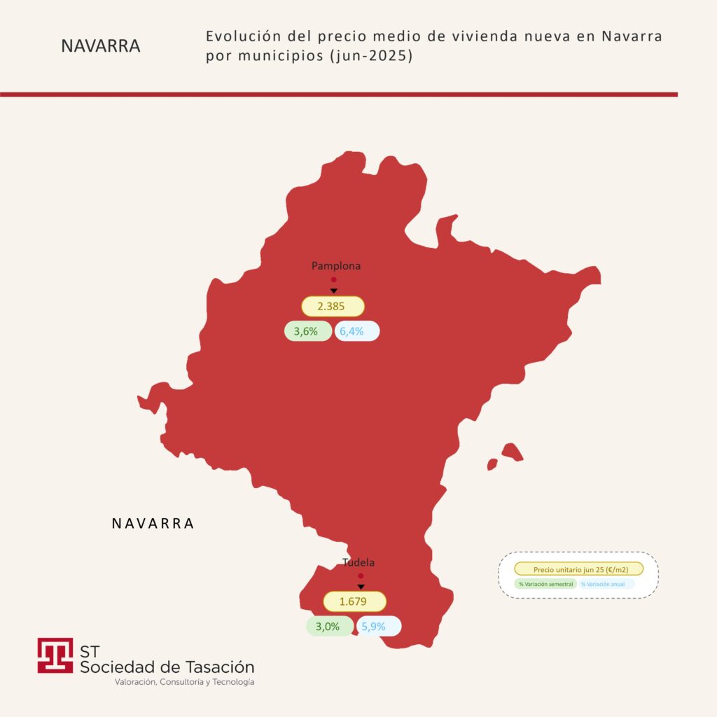 La Comunidad foral se posiciona como una de las comunidades con mayor dinamismo y perspectivas de rentabilidad dentro del mercado inmobiliario del Norte de España. Así lo refleja el último Estudio de Vivienda Nueva en la Franja Norte publicado por Sociedad de Tasación, que analiza la evolución de precios y otros indicadores clave durante el primer semestre de 2025.